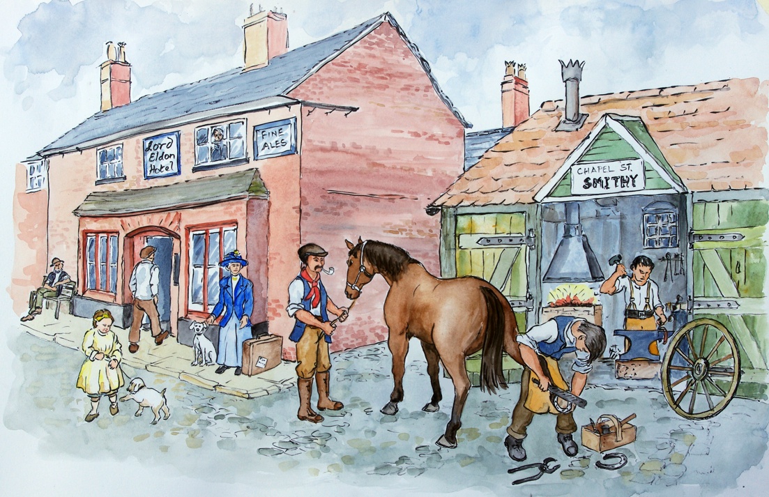 Shoeing a horse by the Lord Eldon hotel, Knutsford